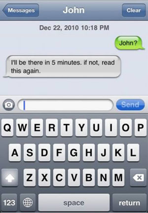 และแม่ก็ตอบกลับมาว่า "ลูกต้องไปโบสถ์กับแม่วันอาทิตย์นี้" และลูกก็ยังได้บอกว่าส่งผิดและจะส่งให้คนอื่น แต่แม่คิดว่า "ยังไงๆซะก็ต้องไปโบสถ์ล่" เป็นอุทาหรธ์ว่าจะส่ง sms อย่าลืมดูให้ดีก่อนนะคะ