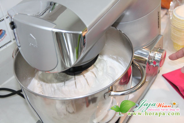 3.ปรับเป็นความเร็วต่ำ แล้วเติมน้ำเชื่อมที่ทิ้งไว้จนเย็นแล้ว ตีต่ออีกประมาณ 5 นาที ปิดเครื่อง