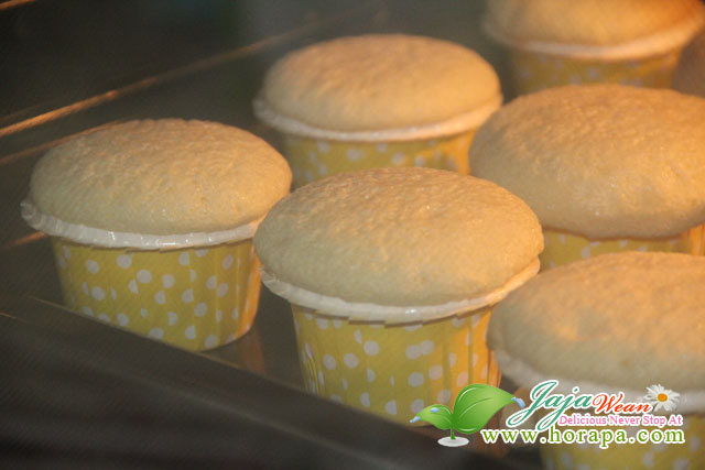 Tips : ไม่ควรเปิดเตาดูขนมบ่อยๆ ถ้าไม่แน่ใจ รอจนเวลาผ่านไปประมาณ 10 นาทีค่อยเปิดดู สังเกตที่หน้าขนม ถ้าสุกแล้วจะแห้ง แล้วใช้ไม้ลองจิ้มลงไปลึกๆดู