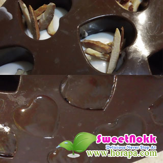สำหรับพิมพ์ชอคโกแลตรูปหัวใจที่เป็นซิลิโคนอันนี้ เรานำไวท์ชอคโกแลตหยอดลงไปก่อน จากนั้นนำถั่วที่คั่วจนหอมแล้วลงไป แล้วจึงหยอดดาร์คชอคโกแลตละลายตามลงไปจนเต็มพิมพ์ ไม่ต้องกลัวว่าจะเลอะหรือว่าล้นพิมพ์ เพราะเมื่อแห้งแล้วเราอาจจะใช้มีมาตัดส่วนเกินออกจนดูเรียบร้อยหรือ ปล่อยไว้อย่างนั้นเหมือนลักษณะของชอคโกแลตทำเอง |