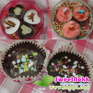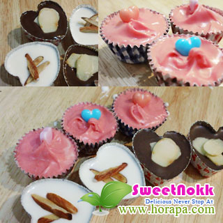 ชอคโกแลตเซทนี้ ใส่ในพิมพ์ขนาดเล็กน่ารักๆ เราใช้ไวท์ชอคโกแลตและดาร์คชอคโกแลต พร้อมกับโรยด้วยถั่ว ส่วนชอคโกแลตสีชมพู รอให้ชอคโกแลตเย็นจนเริ่มหนืดเสียก่อนจึงนำมายอด เพื่อจะมาทำหน้าชอคโกแลตให้สวยงาม และใส่หัวใจที่ทำจากน้ำตาลชิ้นเล็กๆลงไป |