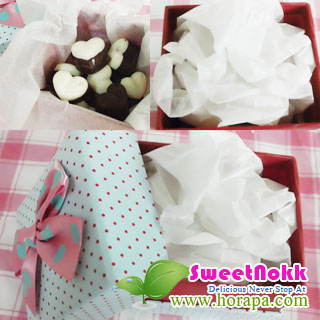 เมื่อมีกล่องสวยๆ อย่าลืมเอากระดาษไขใส่เข้าไปก่อน เพื่อไม่ให้กลอ่งเปื้อนและเพิ่มความสวยงามด้วย และจะได้เก็บกล่องไว้ใช้ได้อีกด้วย การเลือกกล่องที่ดูดี น่ารัก ก็ทำให้ชอคโกแลตของเราน่าทานเพิ่มมากขึ้นด้วยค่ะ