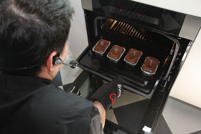 7. ตักใส่ฟลอยด์อลูมิเนียม อบไฟแรง 220 c ประมาณ 7 นาที เอาออกจากเตา ราดด้วย Chocolate cream sauce