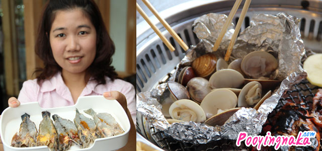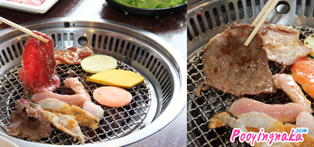 ในส่วนของการปิ้งย่างจะมีทั้ง เนื้อหมู เนื้อไก่ เนื้อวัว อาหารทะเล เบคอน ในบางวันอาจจะมีหอยตลับอบเนยด้วย จะมีผักสดมาให้ห่อด้วยค่ะ ชอบมากๆ ส่วนผักสำหรับย่างนั้นแต่ละวันอาจจะไม่เหมือนกันค่ะ สามารถเติมได้ตลอดโดยบอกพนักงานนะคะ