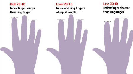 ความยาวของนิ้วมือสามารถบ่งบอกถึงความยาวของอวัยวะเพศได้ นิ้วที่ว่านี้ไม่ใช้ "นิ้วกลาง" อย่างที่หลายคนเดา แต่เป็น "นิ้วนาง" หรือถ้าให้ถูกต้องจริงๆ ก็คือ อัตราส่วนระหว่างความยาวของนิ้วชี้ต่อนิ้วนาง (2D:4D ratio)