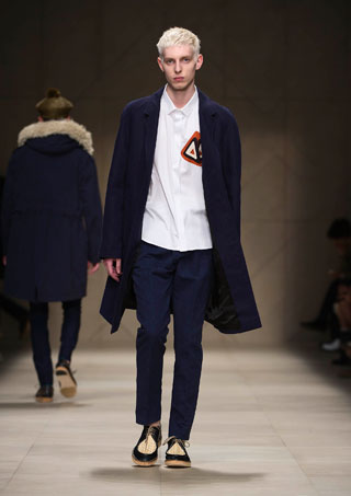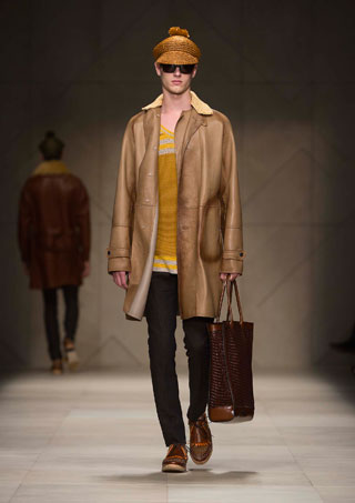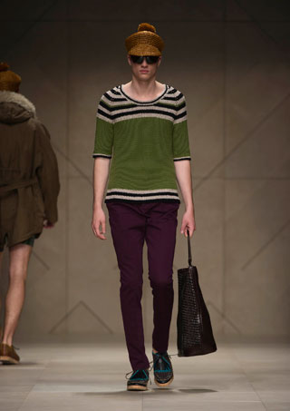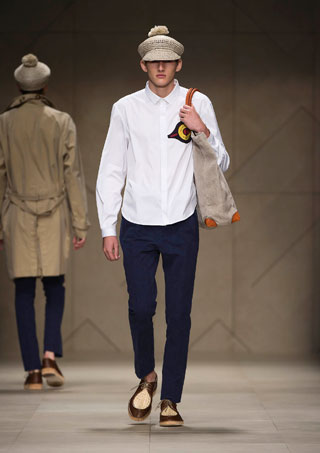 สำหรับคอลเลคชั่นผู้ชาย เบอร์เบอรี่ดีไซน์เสื้อผ้าที่ทำให้คิดถึงความเป็นฤดูใบไม้ผลิ ที่เต็มไปด้วยเสน่ห์แห่งสีสันและความสดใส แฟชั่นที่สอดคล้องไปกับทุกไลฟ์สไตล์การดำเนินชีวิตทันสมัยของสาวกเบอร์เบอรี่ในโลกยุคดิจิตอล นับตั้งแต่แนวเสื้อที่มีความเป็นวินเทจ รวมไปถึงเสื้อคลุมกันลม เทรนช์โค้ตรูปทรงต่างๆ ซีซั่นนี้ คริสโตเฟอร์ เบลีย์ แบรนด์ดีไซเนอร์ของเบอร์เบอรี่ ได้เสริมเสน่ห์ให้กับหนุ่มยุคใหม่ ด้วยลูกเล่นแพตเทิร์นชนเผ่า ลายพิมพ์แบบมัดหมี่หรือมัดย้อม การเรียงร้อยลูกปัด หรือการแต่งขอบเสื้อด้วยโครเชต์ ส่วนวัสดุที่เลือกใช้มีทั้งผ้ากาเบอร์ดีน ผ้าไนลอนพิมพ์ลาย ผ้าแคนวาส ผ้าฝ้าย ผ้าลินินแชมเบรย์ ผ้าวูลลินิน ผ้าฝ้ายพิมพ์ลาย และแอคเซสซอรี่อย่างกระเป๋า ถักทอใบโต หรือกระเป๋าหนังโอเว่อร์ไซส์ ช่วยเพิ่มลุครีแลกซ์ และบางชุดก็มีลูกเล่นโดยใช้การผสมสีของเสื้อ และกางเกงเข้าด้วยกัน สีสันที่เลือกใช้ในซีซั่นนี้ ได้แก่ สีดำ, สีเหลืองโครเมี่ยม, สีน้ำตาลเข้ม, สีเทรนช์, สีน้ำตาลอ่อน, สีบีทรูท, สีเขียวกากี, สีขาว ฯลฯ