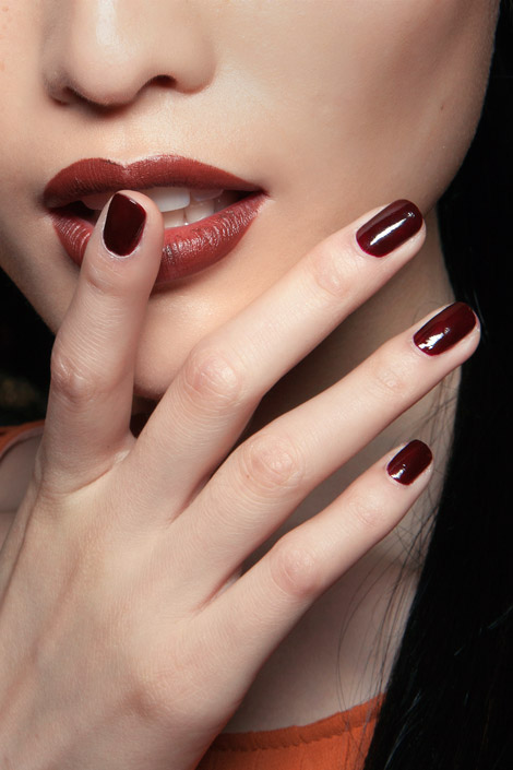 4.จับคู่สีเล็บและริมฝีปากงาม แนะนำให้ลองสีที่แปลกไปกว่าเคย เช่น สีมารูนแบบในภาพ ให้ลุคเข้มแข็งและเซ็กซี่อยู่ในทีค่ะ