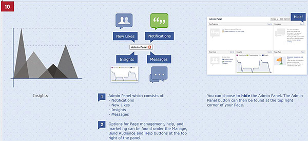 10. มี “Admin Panel” รายงานข้อมูลสำคัญ 4 อย่างคือ Like(แฟน)ใหม่ๆ, Notification , ข้อความใหม่ๆ , และกราฟสถิติเข้าชม (Insight) ให้ดูได้ทันทีด้านบนสุดของหน้าเพจ (จะเห็นได้ต้องเป็นแอดมิน)  ซึ่งสามารถซ่อนได้ถ้าเกะกะสายตา จากเดิมที่ต้องเลือกเข้าไปดูใน “Insight” ในเมนูทางซ้าย
