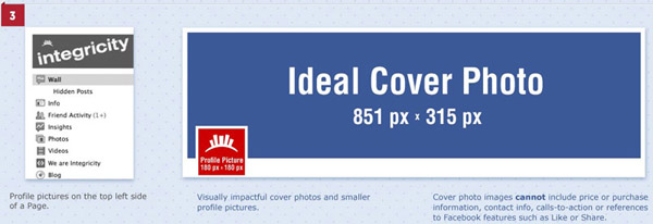 3. มีรูป cover photo ขนาดใหญ่ ควรเลือกรูปขนาดกว้าง 851 pixel สูง 315 pixel ให้พอดีกับพื้นที่ที่ facebook เตรียมไว้ให้เป๊ะๆ เพราะถ้าเลือกเล็กว่านี้ รูปจะถูกขยายขึ้นมา ทำให้ภาพไม่คมชัด ซึ่งจะเห็นผลชัดเจนถ้ามีตัวอักษรอยู่ด้วย ทำให้ดูไม่ดี