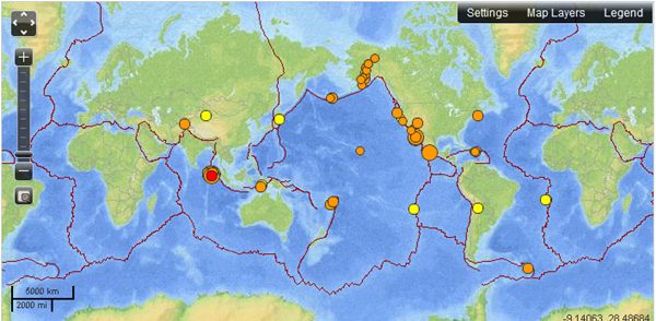 แผ่นที่แสดงการเกิดแผ่นดินไหวตามจุดต่างๆ ทั่วโลก เมื่อวันที่ 12 เม.ย.55 จากเว็บไซต์องค์การสำรวจทางธรณีวิทยาสหรัฐฯ (USGS)