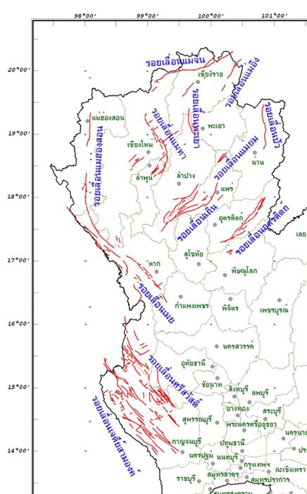 ทั้งนี้ ข้อมูลจากกรมทรัพยากรธรณีระบุรอยเลื่อนมีพลัง 15 รอยเลื่อน ได้แก่