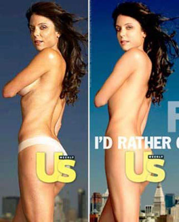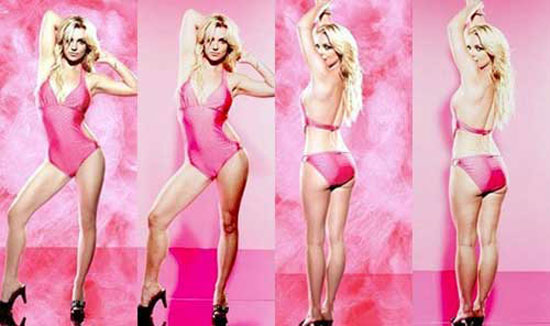 ภาพของ บริทนีย์ สเปียร์ (Britney Spears) อวดหุ่นในชุดว่ายน้ำตอนไม่รีทัชทำให้โลกได้รับรู้ว่า โลกมายาคือ การหลอกลวง ดูได้จากสะโพกและเอวของบริทนีย์จากเดิมที่ล้น พอรีทัชปุ้บกับมีทรวดทรงองค์เอวที่สมบูรณ์