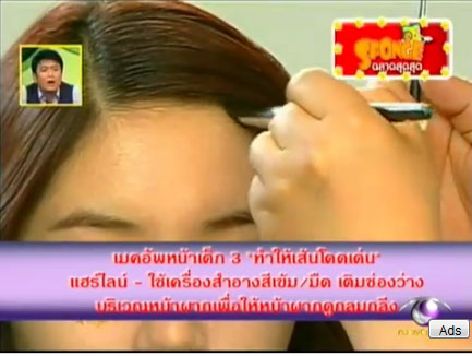 3.ทำให้ลายตรงหน้าผากเป็นเป็นรูปวงกลมดูกลมมนขึ้น โดยเติมด้วยเครื่องสำอางสีเข้ม เมื่อไฮไลท์เส้นกรอบหน้าผากให้ดูกลมแล้วจะทำให้เส้นจมูกดูโดดเด่นขึ้นมาค่ะ