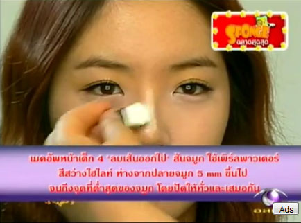 4.กำจัดเส้นปลายจมูก โดยไฮไลท์ที่จุดเหนือปลายจมูกเล็กน้อยและทาไฮไลท์ขึ้นไปตลอดแนวสันจมูกจนถึงโคนจมูกระหว่างลูกตาอย่าให้ยาวเลยขึ้นไป เพราะเราต้องการให้ช่วงจมูกดูสั้นลงค่ะ
