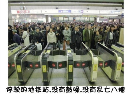 ในซุปเปอร์มาร์ทแห่งหนึ่ง ของตกระเกะระกะเพราะแรงแผ่นดินไหว แต่คนซื้อก็เดินไปช่วยกันเก็บของ แล้วก็หยิบส่วนที่ตนอยากซื้อไปต่อคิวจ่ายเงิน ในรถไฟที่เพิ่งเปิดให้ใช้บริการ และคนที่ตกค้างจำนวนมากกำลังเดินทางกลับ ก็ได้เห็นคนแก่คนหนึ่งลุกให้สตรีมีครรภ์นั่ง คนญี่ปุ่นแม้ในภาวะฉุกเฉินเช่นนี้ ก็ยังมีน้ำใจ มีระเบียบ