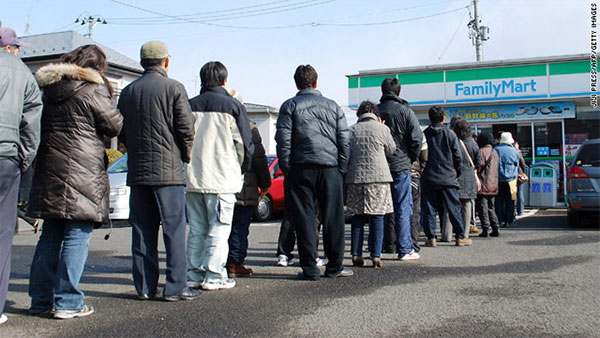 ผู้ประสบภัยชาวญี่ปุ่นเข้าแถวเรียงเดี่ยวอย่างเป็นระเบียบเพื่อเข้าไปซื้อของกินของใช้ในร้านสะดวกซื้อ ภายหลังเหตุหายนะ