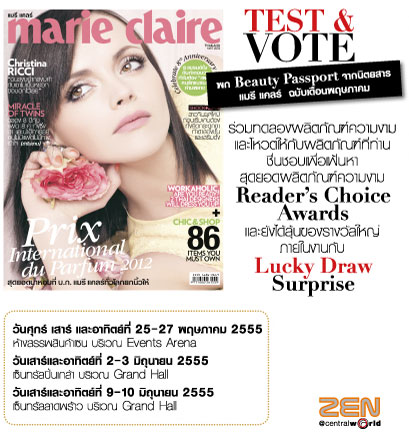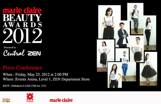 กลับมาอีกครั้งกับกิจกรรมความงามที่สาวๆ ที่หลงใหลในผลิตภัณฑ์ความงามไม่ควรพลาด Marie Claire Beauty Awards 2012 Presented by Central/ZEN ไปทดลองและโหวตให้กับผลิตภัณฑ์ชิ้นโปรด 25-27 พฤษภาคม นี้ที่ห้างสรรพสินค้าเซน พร้อมเจอกับเหล่ากรรมการ อาทิ ลูกเกด-เมทินี, โมเม-นภัสสร, เป็ด-อภิชาติ และดาราเซเลบคับคั่ง อาทิ พีค-ภัทรศยา เครือสุวรรณศิริ, เพชร-รัตนารัตน์ พลอย-รัตนรัตน์ เอื้อทวีกุล, พิตต้า ณ พัทลุง ร่วมด้วยเหล่าเซเลบริตี้แถวหน้า ปิ่น-สุวดี พึ่งบุญพระ, ดวง-มนตร์ลดา พงษ์พานิช, ดวง-วรรณพร โปษยานนท์ ส่วน 2-3 มิถุนายน ร่วมกิจกรรมต่อได้ที่บริเวณ Grand Hall เซ็นทรัลปิ่นเกล้า และ 9-10 มิถุนายน ที่บริเวณ Grand Hall เซ็นทรัลลาดพร้าว