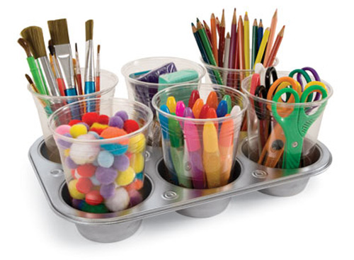 12.นำถาดมัฟฟินมาเก็บอุปกรณ์เครื่องเขียนของเด็กๆโดยติดแม่เหล็กที่ก้นถ้วยยึดให้ติดกับถาด