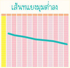 | วันแรกของการมีประจำเดือนเรียงต่อกันเป็นเส้นทแยงมุมต่ำลงเรื่อยๆ แสดงว่า ประจำเดือนมีรอบระยะคงที่แบบมากกว่า 28 วัน สามารถใช้วิธีคุมกำเนิดแบบนับระยะปลอดภัยได้ | ![]() |