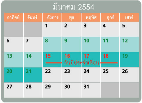 > หากประจำเดือนมาวันแรกคือวันที่ 15 มีนาคม และมาวันสุดท้ายในวันที่ 18 มีนาคม