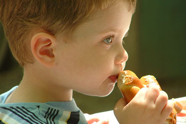 2. อาหารว่างเป็นอาหารที่บริโภคระหว่างมื้อหลัก ควรบริโภคอาหารว่างไม่เกินวันละ 2 มื้อ แต่ละมื้อให้พลังงานไม่เกินร้อยละ 10 ของพลังงานที่ต้องการในแต่ละวัน นั่นคือ สำหรับเด็กเล็ก (อายุ 2-5 ขวบ) ไม่เกินมื้อละ 100-130 กิโลแคลอรี เด็กวัยเรียน (อายุ 6-12 ขวบ) ไม่เกินมื้อละ 150 กิโลแคลอรี เด็กวัยรุ่น (อายุ 13-15 ปี) ไม่เกินมื้อละ 200 กิโลแคลอรี หรือโดยเฉลี่ยมื้อละ 100-150 กิโลแคลอรี สำหรับเด็กอายุ 2-15 ปี