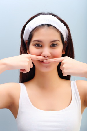 2. ปิดปากค้างไว้เช่นนี้ แล้วใช้ปลายนิ้วชี้แตะที่มุมปากทั้งสองข้าง