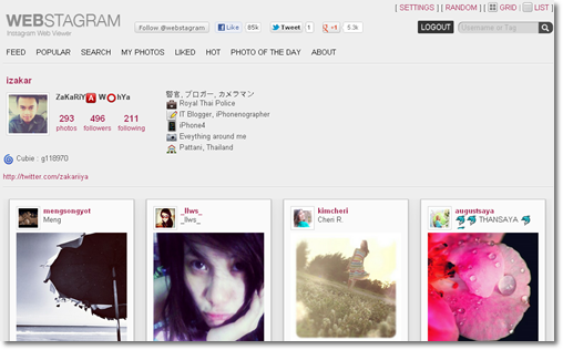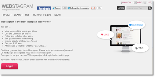 Instagram แอพแต่งรูปแล้วแชร์ กลายเป็นแอพที่ได้รับความนิยมเป็นอย่างมาก แต่การใช้งานนั้น จำกัดอยู่ที่ ต้องใช้งานบน iPhone, Android เท่านั้น มือถืออื่นๆ หรือคอมพิวเตอร์ ไม่สามารถจะเข้าไปใช้งานได้ แต่วันนี้มีเว็บไซต์ ที่จะทำให้ผู้ใช้งาน Instagram สามารถเข้าไปดูรูปจาก Instagram ได้ โดยไม่ต้องใช้ iPhone,  Android โดยที่สามารถ ดูรูป, กด Like, Comment (ไม่สามารถอัพรูปได้นะคะ) และนอกจากนี้ ยังสามารถเอา URL ที่เป็นรูปของเราเอง ไปให้เพื่อนๆ ที่ไม่มี iPhone, Android เปิดดูรูปที่เราถ่ายลง Instagram ได้ด้วย จริงๆแล้วมีทั้งหมดถึง 10 เว็บไซต์ที่สามารถเล่น Instagram ได้ แต่ได้เลือกเอา Webstagram ในการใช้งาน เพราะเท่าที่ลอง Webstagram ใช้งานง่ายที่สุด และหน้าตาสวย ดูดี เข้าใจง่าย มาดูกันเลยค่ะ
