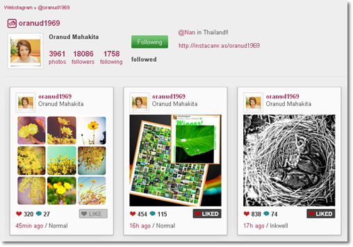 หากเราดูรูปใน Popular แล้วอยากจะ follow คนที่ถ่ายรูปโดนๆ เราก็สามารถคลิกที่ชื่อของคนๆ นั้นได้ แล้วจะมีปุ่มให้เรา follow ได้ทันที (ถ้า follow อยู่แล้ว จะโชว์เป็น following) และเว็บนี้ ยังบอกอีกว่า คนๆ นี้ follow เราหรือป่าว อย่างในรูป แสดงเป็น followed แสดงว่า ต่างคนต่าง follow กันแล้ว