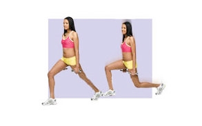 ยืนแยกขาให้ขาขวาอยู่หน้า ห่างจาขาซ้ายประมาณ 30-35 เซนติเมตร ถือดัมเบลล์หนัก 1-2 กิโลกรัมในมือทั้งสองข้าง แขนเหยียดตรงอยู่ข้างลำตัว หลังตรง แขม่วพุง และตามองไปข้างหน้า ค่อยๆย่อขาลงจนเข่าซ้ายเกือบแตะพื้น ค้างไว้สองวินาที และกลับสู่ท่าเริ่ม ทำซ้ำ 10-12 ครั้งแล้วสลับขา