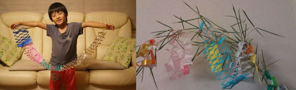 4)    นำด้ายมาผูกกับกระดาษ จากนั้นนำไปห้อยบนกิ่งไผ่
