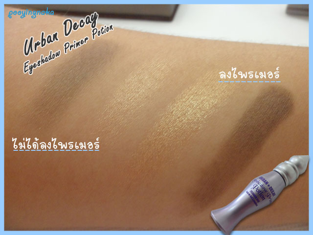 ลองเปรียบเทียบอายแชว์โดว์ ซี่งมาจากพาเล็ท Naked1 จะเห็นได้ชัดว่าเมื่อลงไพรเมอร์สีจะชัดขึ้น (ปาดสีเท่ากันและน้ำหนักไม่ต่างกันค่ะ)ช่วยให้สีติดทนมากค่ะ