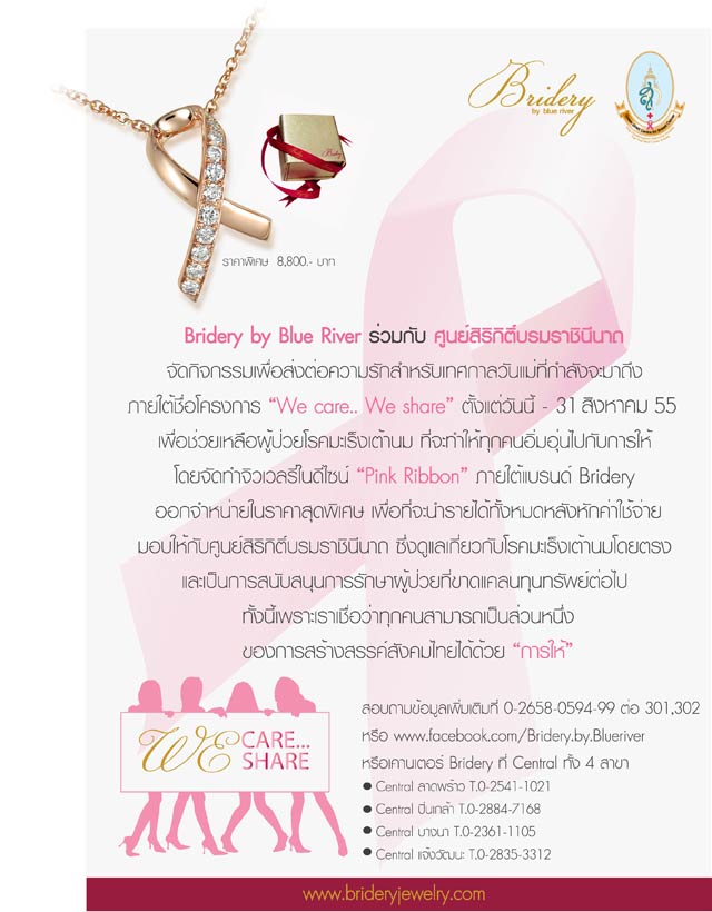 Bridery by Blue River ร่วมกับ ศูนย์สิริกิติ์บรมราชินีนาถ จัดกิจกรรมเพื่อส่งต่อความรักสำหรับเทศกาลวันแม่ที่กำลังจะมาถึง ภายใต้ชื่อโครงการ “We care.. We share” ตั้งแต่วันนี้ – 31 สิงหาคม 55 เพื่อช่วยเหลือผู้ป่วยโรคมะเร็งเต้านม โดยจัดทำสร้อยคอพร้อมจี้เพชรทองชมพูในดีไซน์ “Pink Ribbon” ภายใต้แบรนด์ Bridery ออกจำหน่ายในราคาสุดพิเศษ เพื่อที่จะนำรายได้ทั้งหมดหลังหักค่าใช้จ่ายมอบให้กับศูนย์สิริกิติ์บรมราชินีนาถ ซึ่งเน้นการบริการ การตรวจและรักษาโรคมะเร็งเต้นนมในสตรี รวมถึงการให้ความรู้และคำปรึกษาเกี่ยวกับโรคนี้โดยตรง