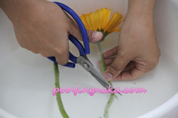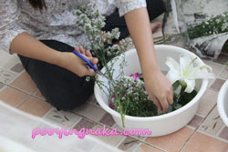 1. แช่โอเอซิสทิ้งไว้ในน้ำให้ชุ่ม ประมาณ 3-4 ชั่วโมง แล้วตัดดอกไม้ให้ได้ขนาดความยาวตามต้องการ กะให้เมื่อปักดอกไม้ลงไปแล้ว จะได้พุ่มทรงกลม โดยให้ตัดก้านดอกไม้ในน้ำ เพื่อความคงทน สดอยู่ได้นานค่ะ