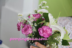2. เลือกปักดอกไม้หลักลงไปในตำแหน่งที่ต้องการก่อน เราเลือกปักตรงตำแหน่งที่ประมาณ 2-3 นาฬิกา ด้านที่ต้องการให้เป็นด้านหน้าของช่อบูเก้ค่ะ..แล้วเสริมด้วยดอกคาร์เนชั่น เว้นจังหวะให้ดูสมดุลย์ทั่วทั้งช่อ (ขออภัยถ่ายรูปไม่ค่อยทันป้าเค้าเลยค่ะ ปักไวมั่ก)