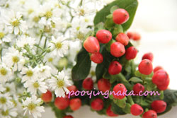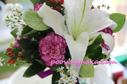 3. ดอกไม้ย่อย ดอกเล็กๆ ช่วยเสริมให้ช่อบูเก้ดูมีชีวิตชีวา งดงามสมบูรณ์ขึ้นไปอีกค่ะ เราใช้ดอกคัตเตอร์ และมิกกี้เม้าส์ค่ะ
