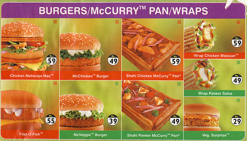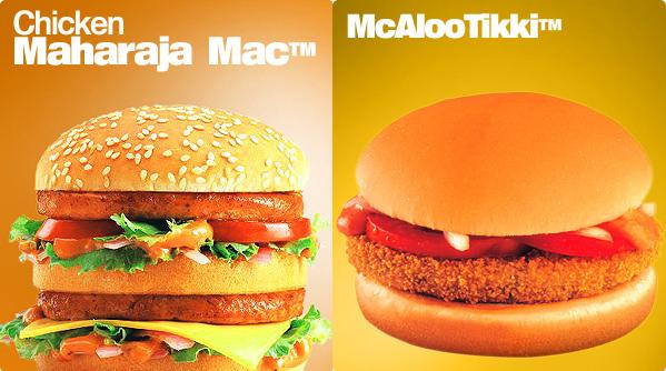 โดยในเมนูที่เราๆคุ้นเคยอย่าง เบอร์เกอร์เนื้อ หรือหมู ซึ่งเป็นของต้องห้ามของชาวฮินดูและมุสลิม อาจจะถูกแทนที่ด้วย แมคไก่มหาราชา(the Chicken Maharajah Mac) หากแต่แท้จริงแล้ว คนอินเดียเกือบทั้งประเทศเป็นมังสวิรัติ ดังนั้นทางแมคโดนัลด์จึงต้องระดมความคิดสร้างสรรค์เมนูที่เป็นมังสวิรัติแท้ๆ อย่างเช่น McAloo Tikki Burger ซึ่งจะทำจากมันฝรั่งบดแบบข้นเหนียวแล้วนำมาทอด นอกจากนี้ยังมี McEgg ไข่ดาวเนื้อนิ่มแบบไม่สุกวางบนแป้งเบอร์เกอร์แล้วตกแต่งด้วยหอมแขก เสิร์ฟพร้อม โยเกิร์ตซอส และPizza McPuff ของกินเล่นประเภทพายทำจากผักและชีสหน้าตาดูแล้วน่าจะเหมือนซาโมซายักษ์มากกว่า(แล้วจะตั้งชื่อเป็นพิซซ่าทำไมก็ยังสงสัยอยู่ ?)
