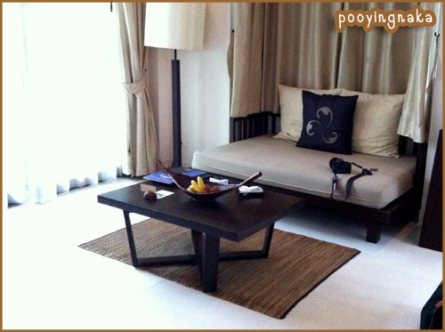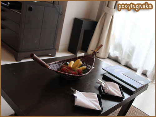 บริเวณนี้ เปิดห้องเข้ามาจะมีพื้นที่สำหรับนั่งพักผ่อน อ่านหนังสือพิมพ์ และมีผลไม้ไว้รอเลยค่ะ ตรงนี้ก็กว้างแล้วนะคะเนี่ย