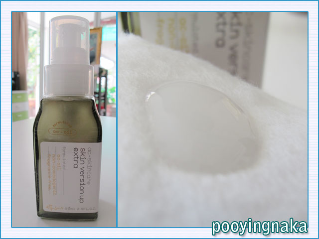 ขวดนี้นะคะ เป็นขวดแก้ว (จริงๆไม่ชอบผลิตภัณฑ์ที่เป็นขวดแก้วเลย เป็นคนไม่ระมัดระวัง) เป็นขวดปั้ม สำหรับนกแล้วไม่ใช่คนที่เป็นสิวง่าย แต่อาจจะมีบ้างช่วงใกล้รอบเดือน ส่วนมากสิวที่เป็นคือสิวเสี้ยนบริเวณจมูกค่ะ สำหรับ Skin Version Up extra เค้าให้ใช้หลังจากล้างหน้าแล้วนะคะ ให้ปั้มออกมา 2 ปั้ม