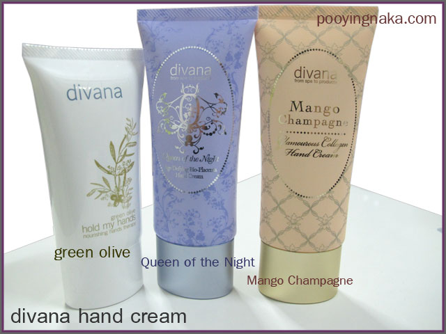 นกเป็นคนที่ชอบผลิตภัณฑ์ประเภท hand cream มาก ชอบทามือมาก และสามหลอดนี้ได้มาจาก divana ซึ่งเป็นสปา แต่มีขายผลิตภัณฑ์ของทางสปาด้วยค่ะ จริงๆมีขายทั้งที่พารากอนและเอ็มโพเรียมนะคะ ลองไปดูกันได้ แพคเกจเค้าจะน่ารักมากๆค่ะ เรามีสามกลิ่น green olive, Queen of the Night, Mango Champagne