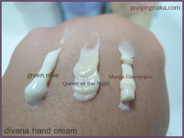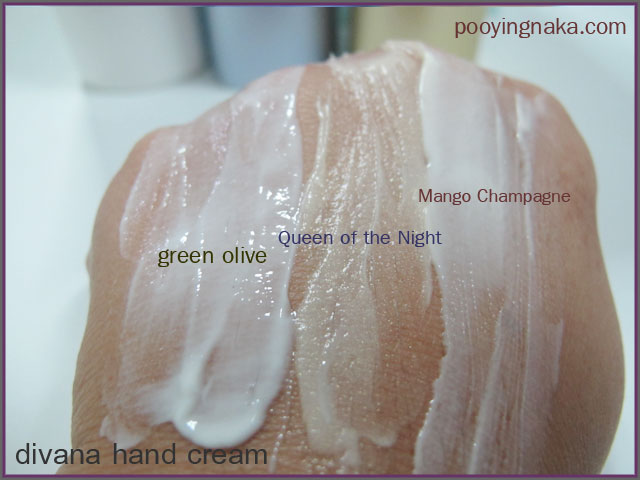 เนื้อครีมนะคะ ถ้าเบาหน่อยก็จะเป็น green olive กลิ่นหอมออกแนวสดชื่นค่ะ ส่วน Queen of the Night กลิ่นเย้ายวนมีชิมเมอร์เล็กๆด้วยค่ะ สุดท้ายเป็น Mango Champagne กลิ่นจะเป็นมะม่วงสุก หอมหวานมากๆ (กลิ่นที่นกชอบที่สุดในสามกลิ่น)
