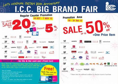 พบกับ Promotion I.C.C Big Brand Fair Oct.2012 Sale up to 50% Off ที่ศูนย์การค้า Isetan ได้ตั้งแต่วันนี้ ถึงวันที่ 7 พฤศจิกายน 55 นี้เท่านั้น (งานนี้จัดพร้อมๆกับกับเทศกาลเซลล์ครั้งใหญ่ ISETAN Big Thanks Sale 2012) ช๊อปกันจุใจเลยค่ะ