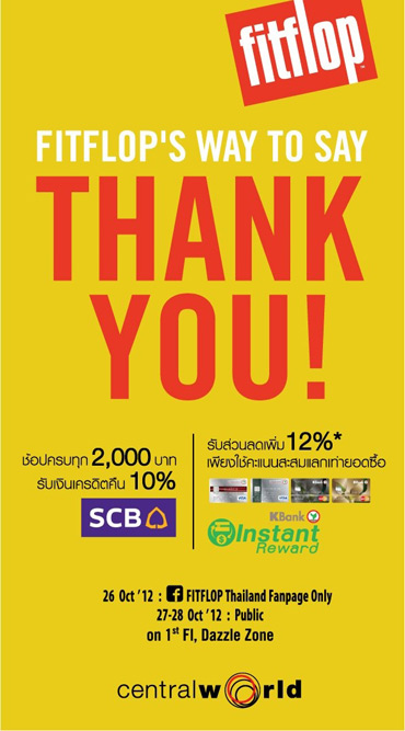 - วันที่ 26 ต.ค. เป็นรอบเฉพาะผู้ที่ลงทะเบียนกับ www.facebook.com/fanpage.fitflopthailand (ติดตามกติกาและเงื่อนไขในการลงทะเบียนได้ในวันที่ 22 ต.ค.55)