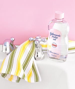 ใช้เบบี้ออยล์เป็นที่ขัดเงาอุปกรณ์เครื่องใช้จำพวก โครมเมี่ยม หรือชุบโครเมี่ยม เช่น ก็อกน้ำ อ่างล้างจาน รับประกันความแวววับ จับตาค่ะ