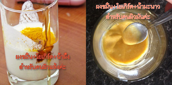 ขั้นตอนก็แค่เพียงผสมผงขมิ้นชันกับโยเกิร์ตและน้ำมะนาวแต้มที่สิวก่อนนอนโดยไม่ต้องล้างออก หรือหากไม่แน่ใจว่าจะแพ้หรือไม่ ในครั้งแรกให้ทาทิ้งไว้ประมาณ 10 นาที(สามารถทาให้ทั่วทั้งหน้าเลยก็ได้ค่ะ)แล้วล้างออกด้วยน้ำสะอาด สำหรับใครที่มีปัญหารูขุมขนกว้าง ผู้หญิงนะคะก็ขอแถมเคล็ดลับวิธีกระชับรูขุมขนซึ่งทดลองกับตัวเองแล้วว่าได้ผลจริง โดยการล้างหน้าด้วยน้ำเย็น และจะต้องเป็นน้ำเย็นที่ออกมาจากตู้เย็นเลยนะคะ ใส่ภาชนะที่คุณสามารถจุ่มหน้าลงไปได้ ก้มหน้าลงแช่กลั้นหายใจไว้สักครู่แล้วทำซ้ำๆ สุดท้ายใช้น้ำนั้นล้างหน้าให้สะอาดหมดจด คุณจะรู้สึกได้ทันทีว่ารูขุมขนกระชับขึ้น แต่ในส่วนของรอยแผลอาจต้องใช้เวลาประมาณ 2 อาทิตย์จึงจะหายไปจน ใบหน้าเกลี้ยงเกลาหมดจด