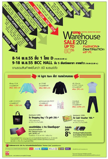พบกับCMG Warehouse Sale ลดสูงสุด 80% (พย.55) ได้ตั้งแต่วันที่ 8 -14 พฤศจิกายน 2555 ที่ Central ลาดพร้าว บริเวณชั้น 1 โซน D และในวันที่ 9 -18 พฤศจิกายน 2555 งานจะถูกย้ายไปจัดที่ บริเวณชั้น 5 BCC Hall