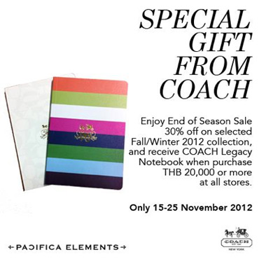 สินค้าราคาพิเศษทั้ง Handbags และ Accessories Fall/Winter 2012 collection (รุ่นที่ร่วมรายการ) สุดเริ่ดจาก COACH ในราคาลดสูงสุด 30% พิเศษ! รับฟรี Legacy Notebook เมื่อช้อปครบ 20,000 บาทขึ้นไป