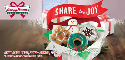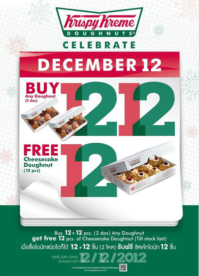 12/12/12 Krispy Kreme รับสิทธ์ซื้อ 2 (โหล) แถม 1 (โหล) เมื่อซื้อโดนัทชนิดใดก็ได้ 12+12 ชิ้น (2 โหล) รับฟรี! ชีสเค้กโดนัท 12 ชิ้น (จนกว่าสินค้าจะหมด)
