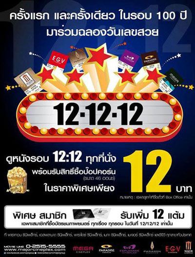 ครั้งแรกและครั้งเดียวในรอบ 100 ปี! Major Cineplex ชวนคอหนังมาร่วมฉลอง 12/12/12 กับโปรโมชั่น ดูหนังรอบ 12.12 น. ทุกที่นั่ง ทุกสาขา ในราคาเพียง 12 บาท!