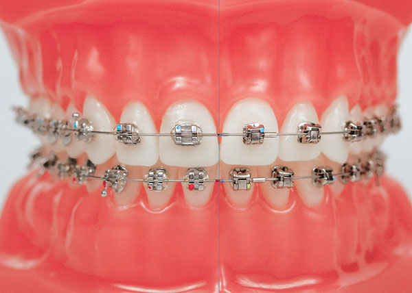 - เครื่องมือแบบโลหะ เราจะเห็นได้ทั่วๆไป ที่เป็นโลหะติดอยู่ที่ฟันของคนไข้ เรียกกันว่าเหล็กจัดฟัน(ทางทันตแพทย์เรียกว่า Brackets หรือทั่วไปเรียกกันว่า Braces) เครื่องมือชนิดนี้นับว่ามีประสิทธิภาพสูง มักจะเป็นทางเลือกแรกของทันตแพทย์จัดฟัน เนื่องจากสามารถเคลื่อนฟันได้ครบทุกทิศทาง และเคลื่อนรากฟันได้ด้วย แต่ข้อเสียของเครื่องมือประเภทนี้คือ มองเห็นได้ชัดเจนว่าเราจัดฟันอยู่ และทำความสะอาดยากขึ้น ทำให้หมอต้องมั่นใจก่อนว่าคนไข้จะทำความสะอาดฟันได้ดี และมีอนามัยช่องปากที่สะอาดสมบูรณ์ ก่อนที่จะติดเครื่องมือชนิดนี้