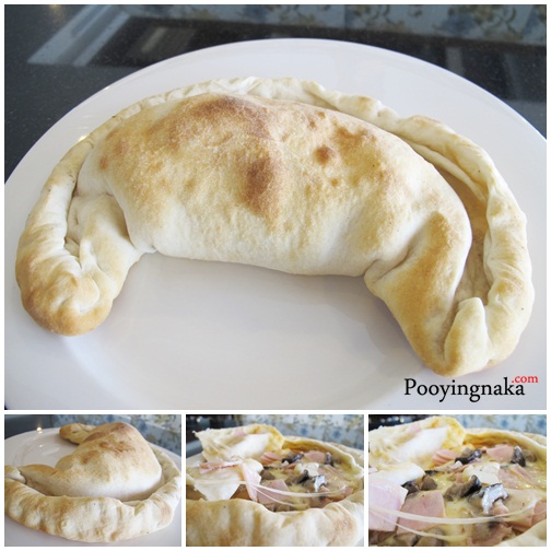 เมนูแรกค่อนข้างจะทำให้เราตื่นเต้นอยากจะลองทานกันมากๆ ก็คือ พิซซ่า แต่พิซซาที่นี่ไม่เหมือนพิซซ่าทั่วไปนะคะ เพราะเป็นพิซซ่าพัฟแบบอิตาเลียนแท้ๆเลยค่ะ มีชื่อว่า Calzone Classico Pizza เป็นแป้งแบบบาง ส่วนด้านในมีไส้เห็ด แฮม มอซซาเรลล่าชีสและมะเขือเทศ อร่อยมากๆ ถ้าใครได้ชิมต้องติดใจแน่นอน